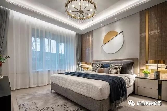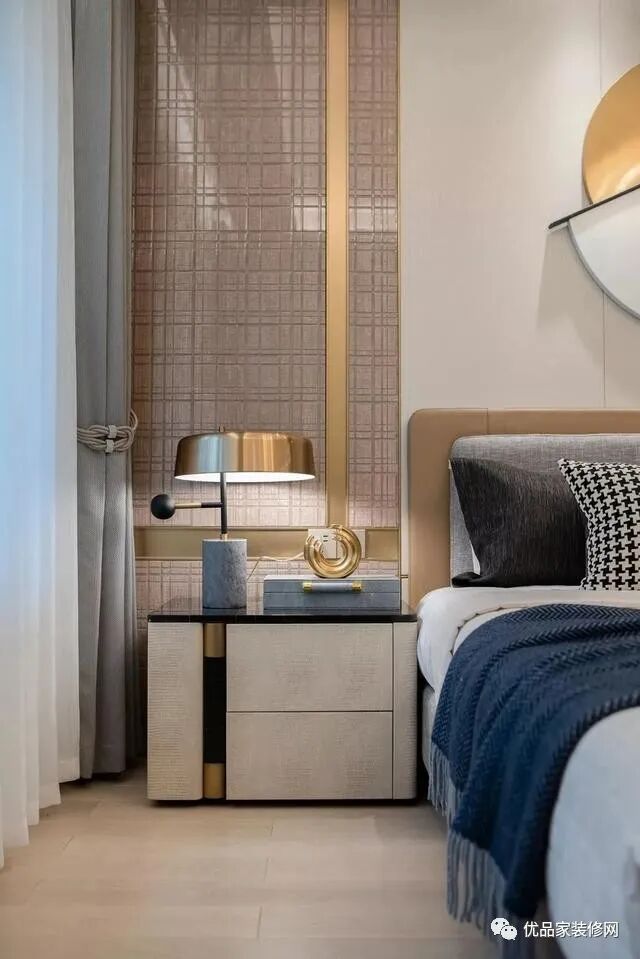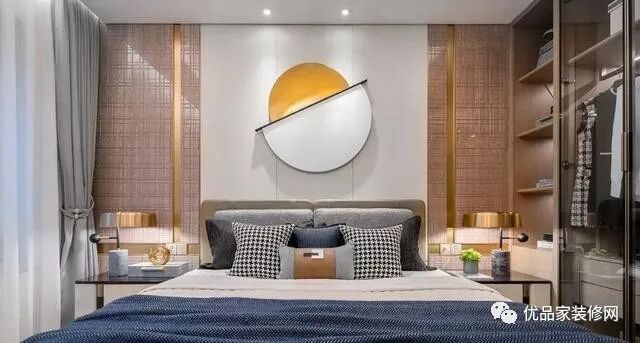 ▲卧室床头墙中间区域是灰色硬包,挂着一幅圆形的白色+金色装饰画,也让空间显得更加华丽精致而优雅,两侧是的独特的凹凸质感的对称造型设计,布置相应的床头柜,搭配灰色床铺与蓝白色的床单,也充满高级优雅的精致感。