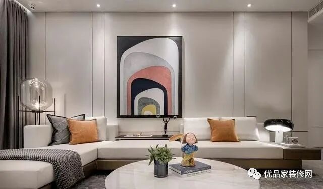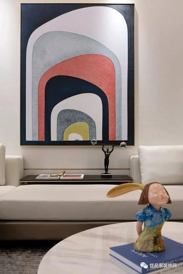 ▲沙发款式独特,在挂画下的位置取消靠背,加入一个小边茶几的功能设计,书籍、摆饰品与手机,都可以放在这里,提升客厅的优雅与高级感。