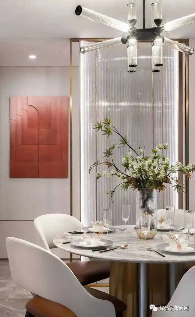▲餐厅布置金属脚架的餐桌椅组合,皮艺靠背坐垫的餐椅+石材质感的圆餐桌,餐桌上布置餐具、酒杯与花瓶,也让用餐空间显得精致优雅的华丽。后方墙面挂画、金属+长虹玻璃的隔断,也让空间显得更加高级精致而优雅。