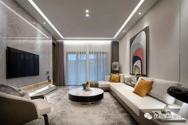 ▲电视墙以灰色大理石质感的背景墙基础,加入地台式电视柜,还有木色的长城板背景与暗藏灯带的烘托,壁挂上电视机,整体简雅的设计,布置一张圆形的石材台面茶几,也让空间更加高级档次。